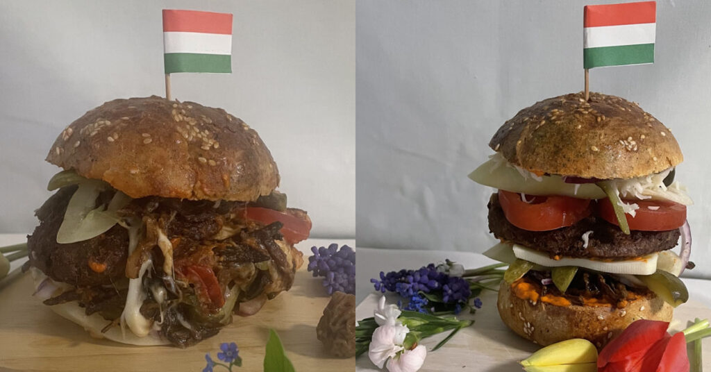 Feltét: pirított vöröshagyma csíkok, sajt, uborka, paradicsom, paprika, hamburger hús, Cseh kucsmagomba, medvehagyma, mustár, pirosarany.