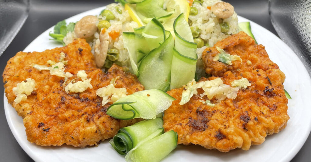 Sertéskaraj pikáns bundában, párolt zöldséges-gombás (Déli tőkegomba, Rőt fagomba) rizzsel.
